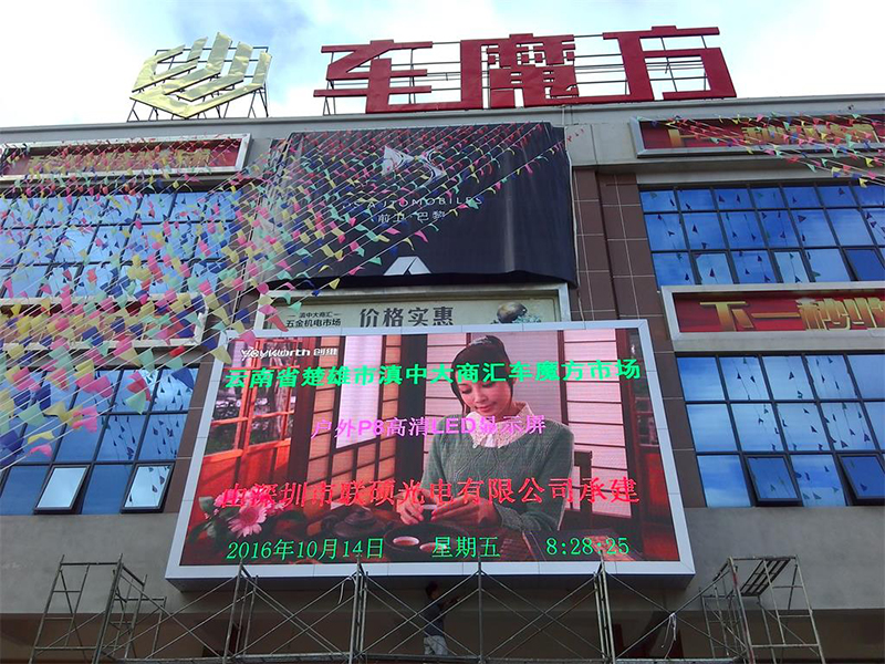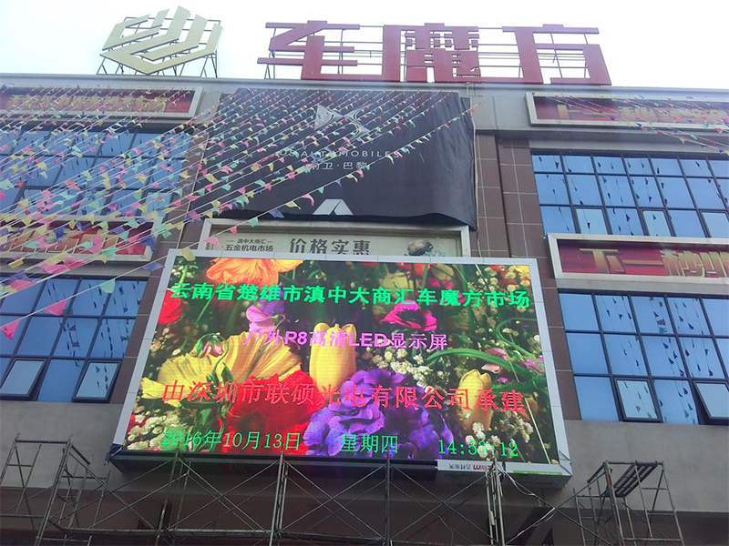 近日,聯(lián)碩光電戶外P8全彩顯示屏成功進(jìn)駐云南楚雄市車魔方!下面我們一起來欣賞P8LED大屏幕精彩瞬間。